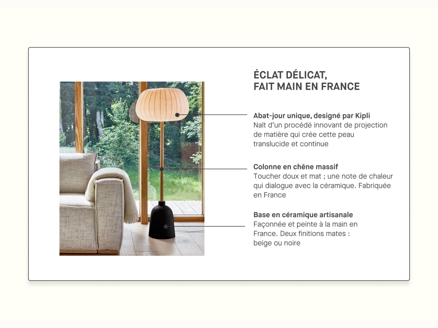 Du bois de chêne sculpté à la céramique tournée avec patience, chaque composant du lampadaire HIKARI est issu d’un artisanat européen minutieux. Il est le fruit d’un geste lent, d’un respect des matériaux, pour une lumière durable et sincère.
