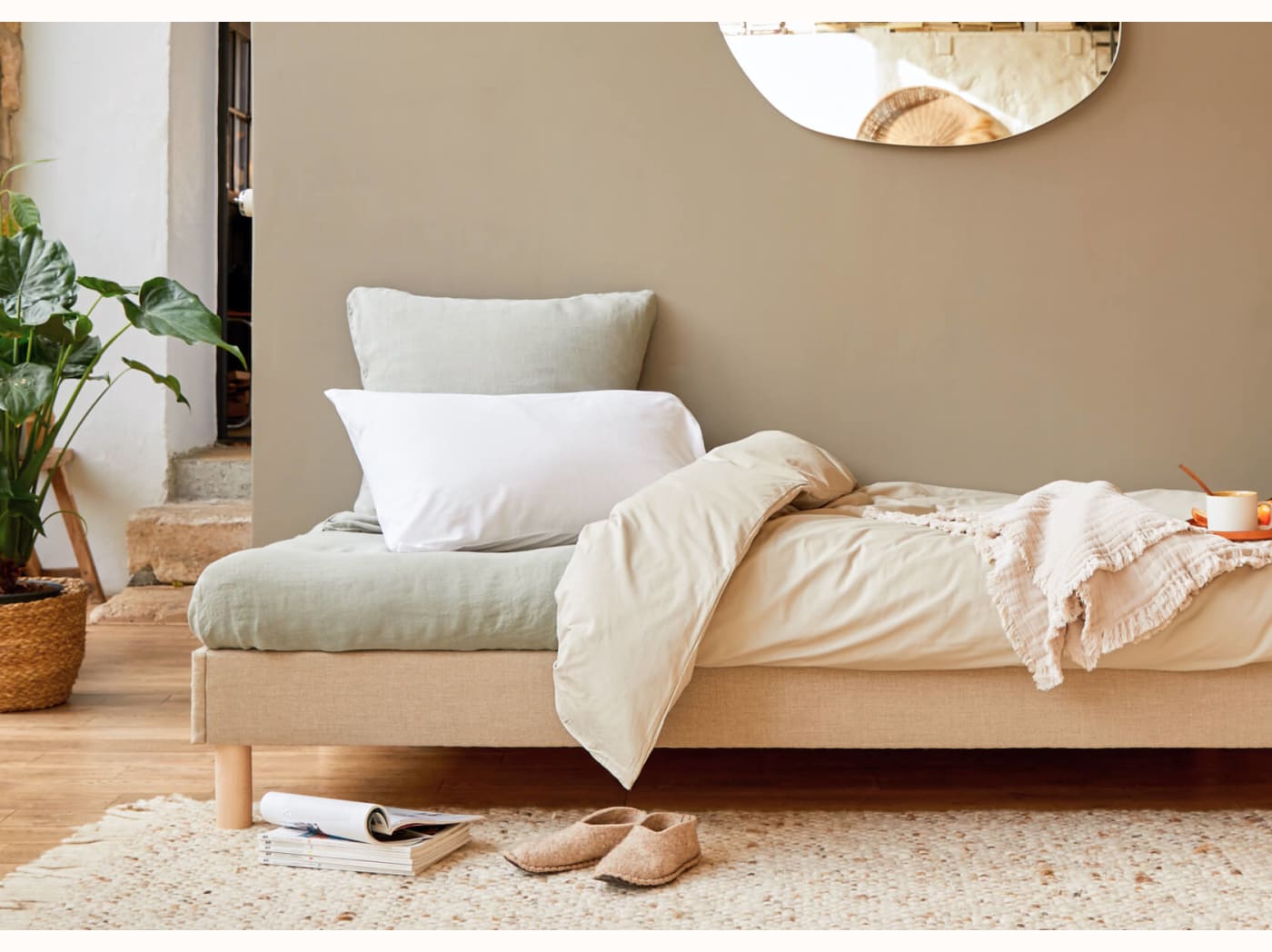 Le lit banquette Kipli associe naturalité et confort. Pour composer cet ensemble, nous avons choisi des éléments fabriqués en France :