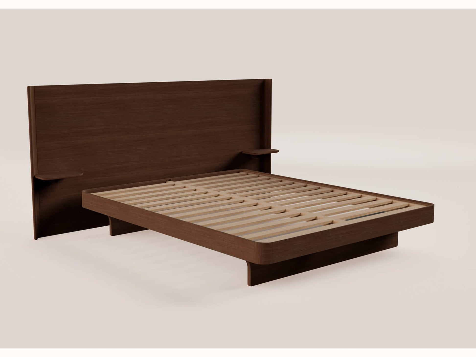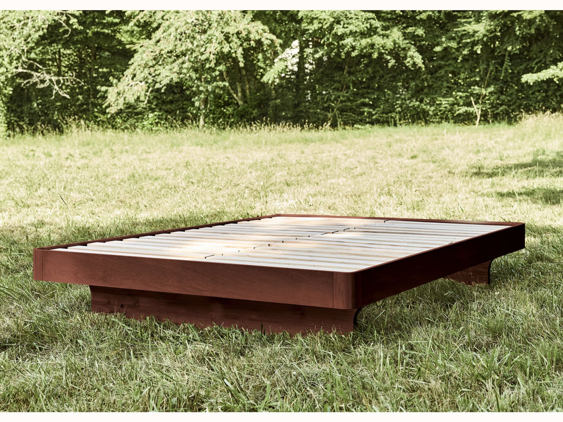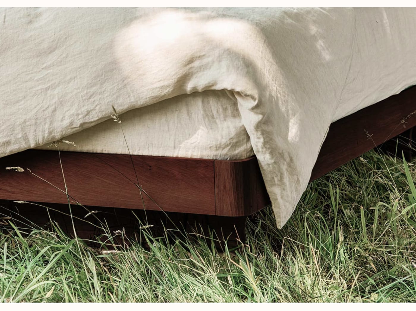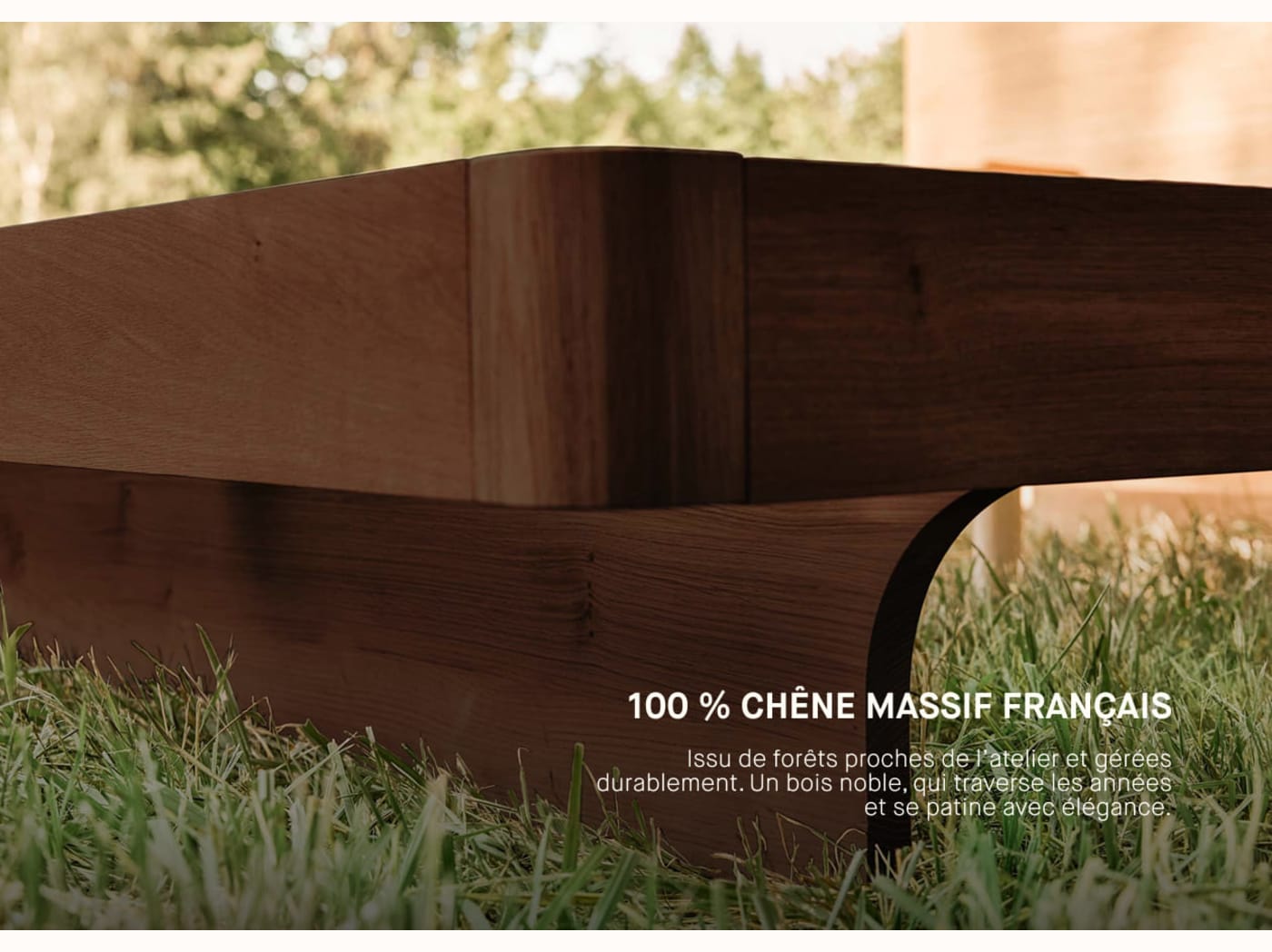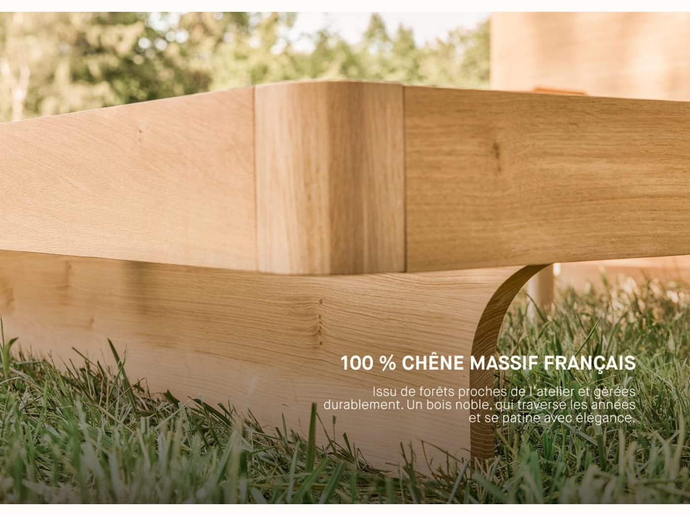 - Pieds longs et arqués en bois massif, reflétant la courbe d’un hamac.