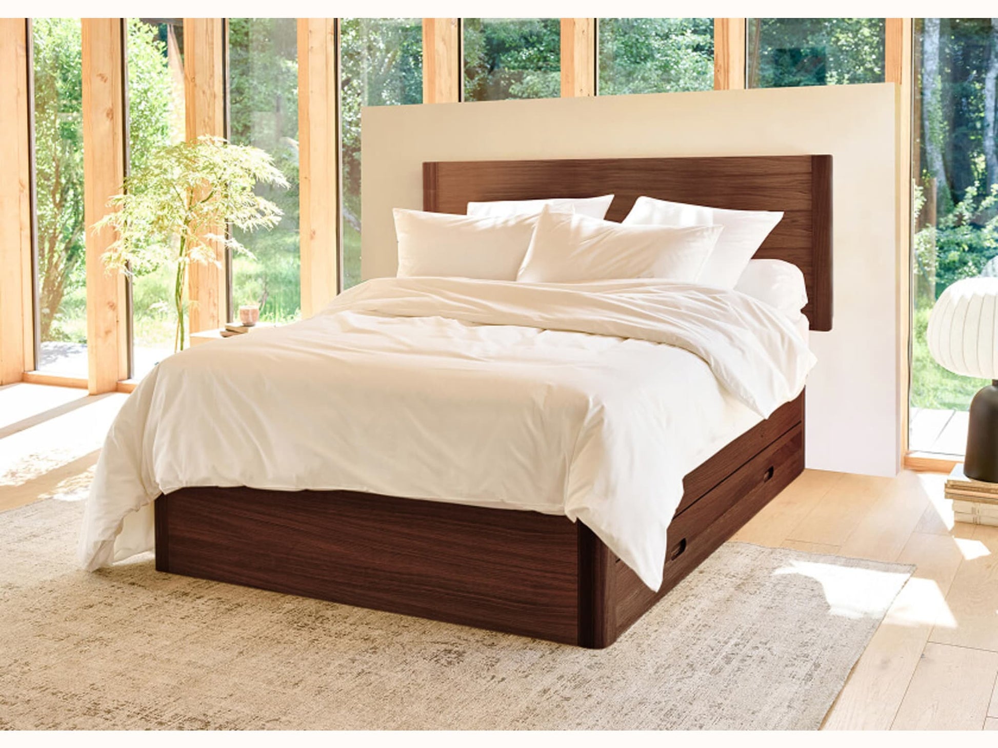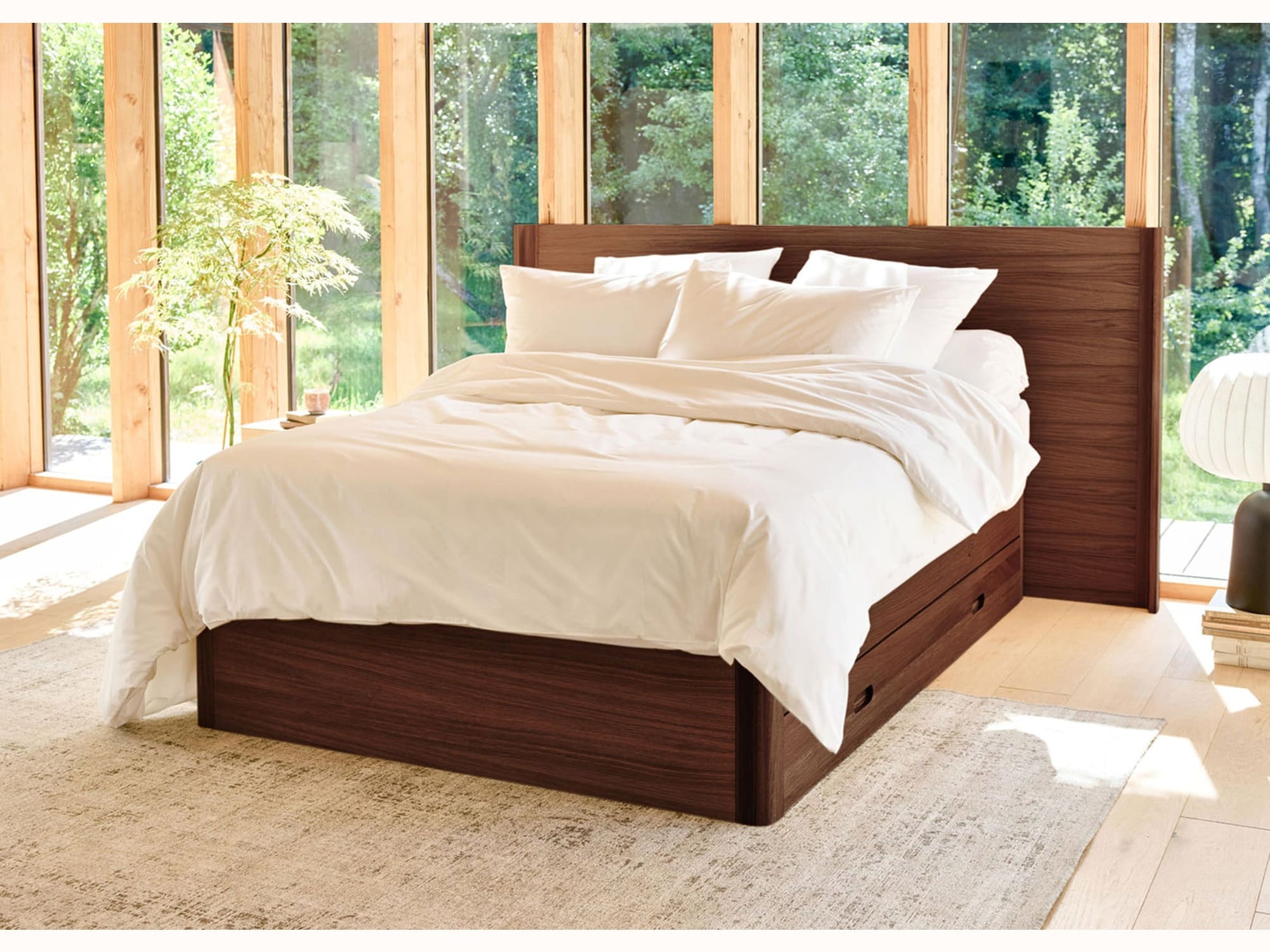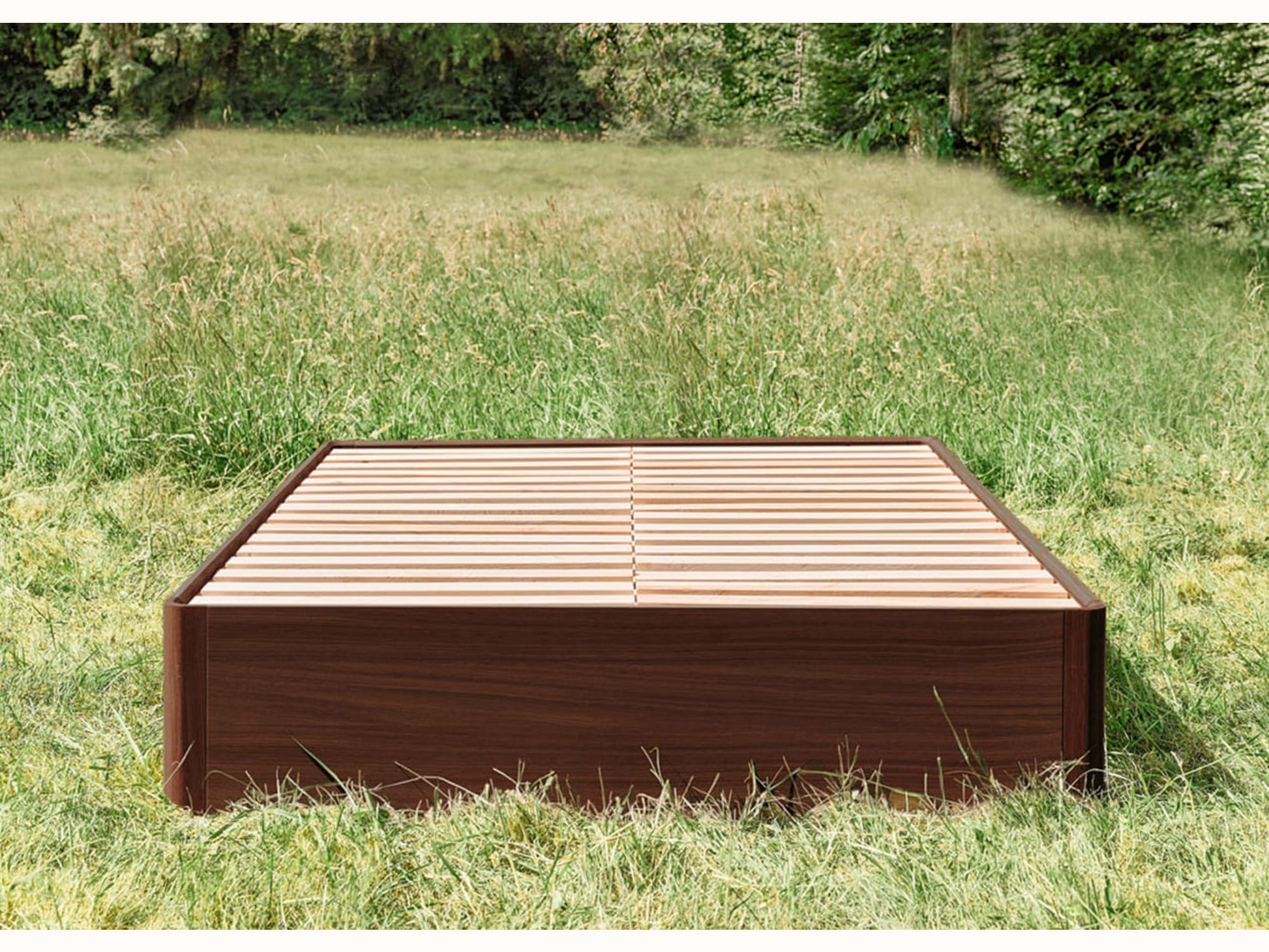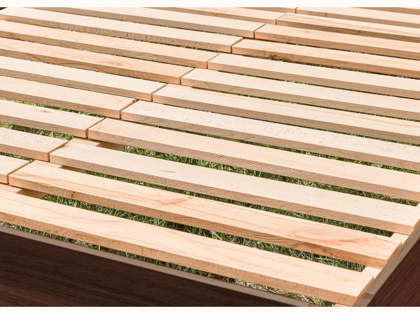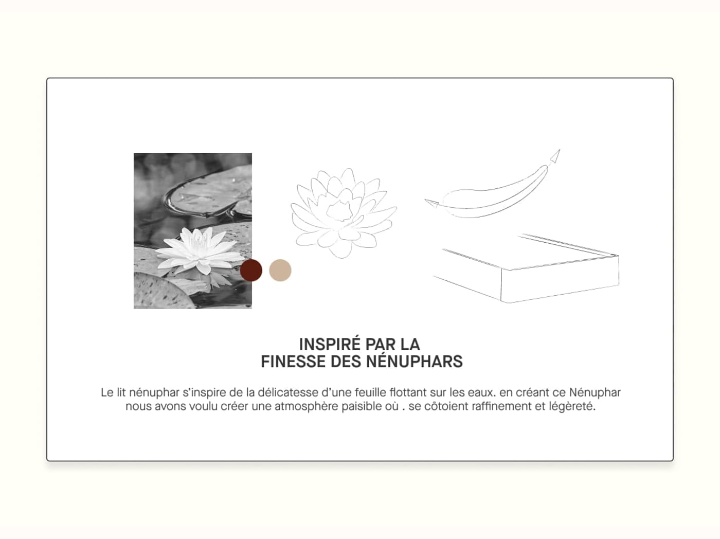 - Pieds plats, larges et flottants en bois massif, inspirés des nénuphars.