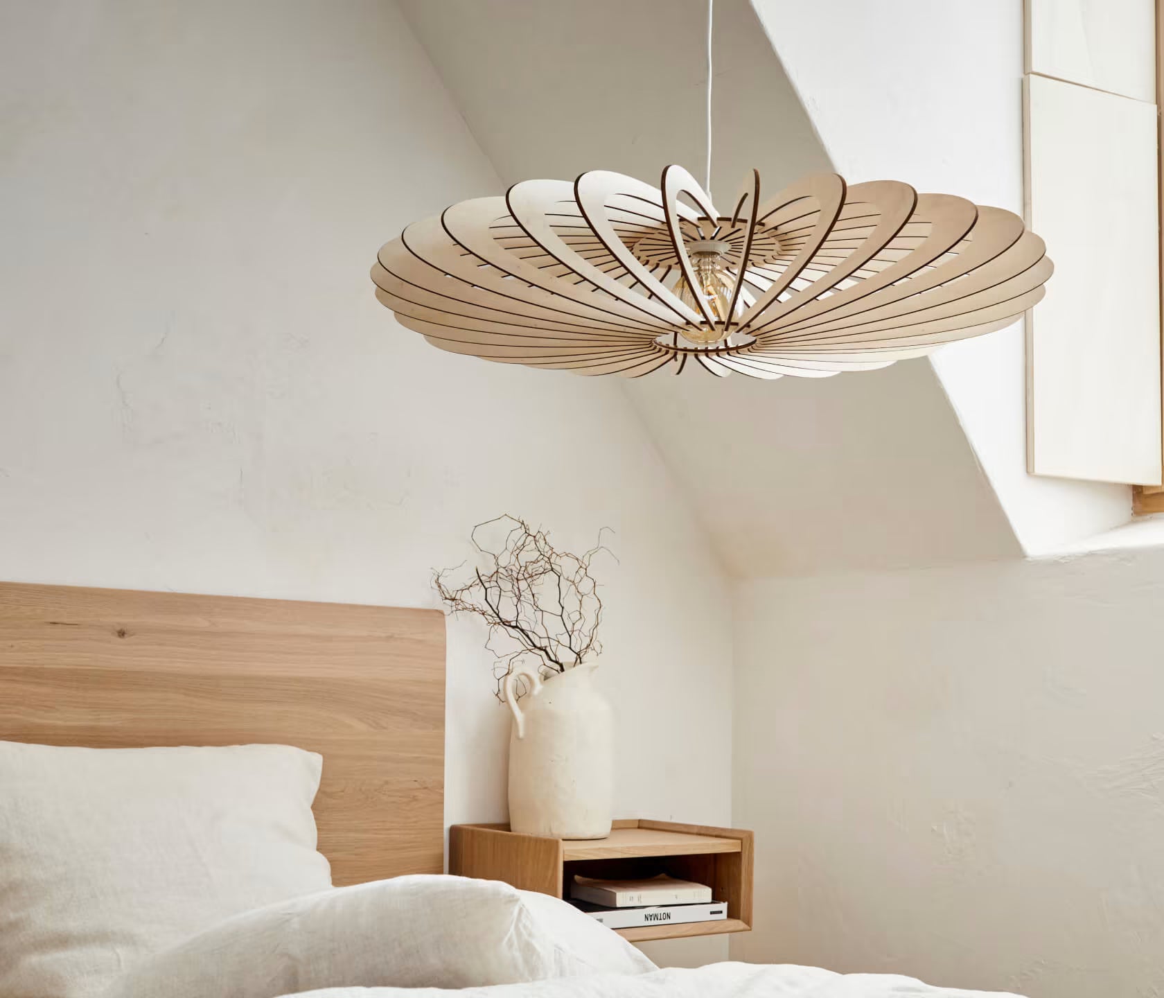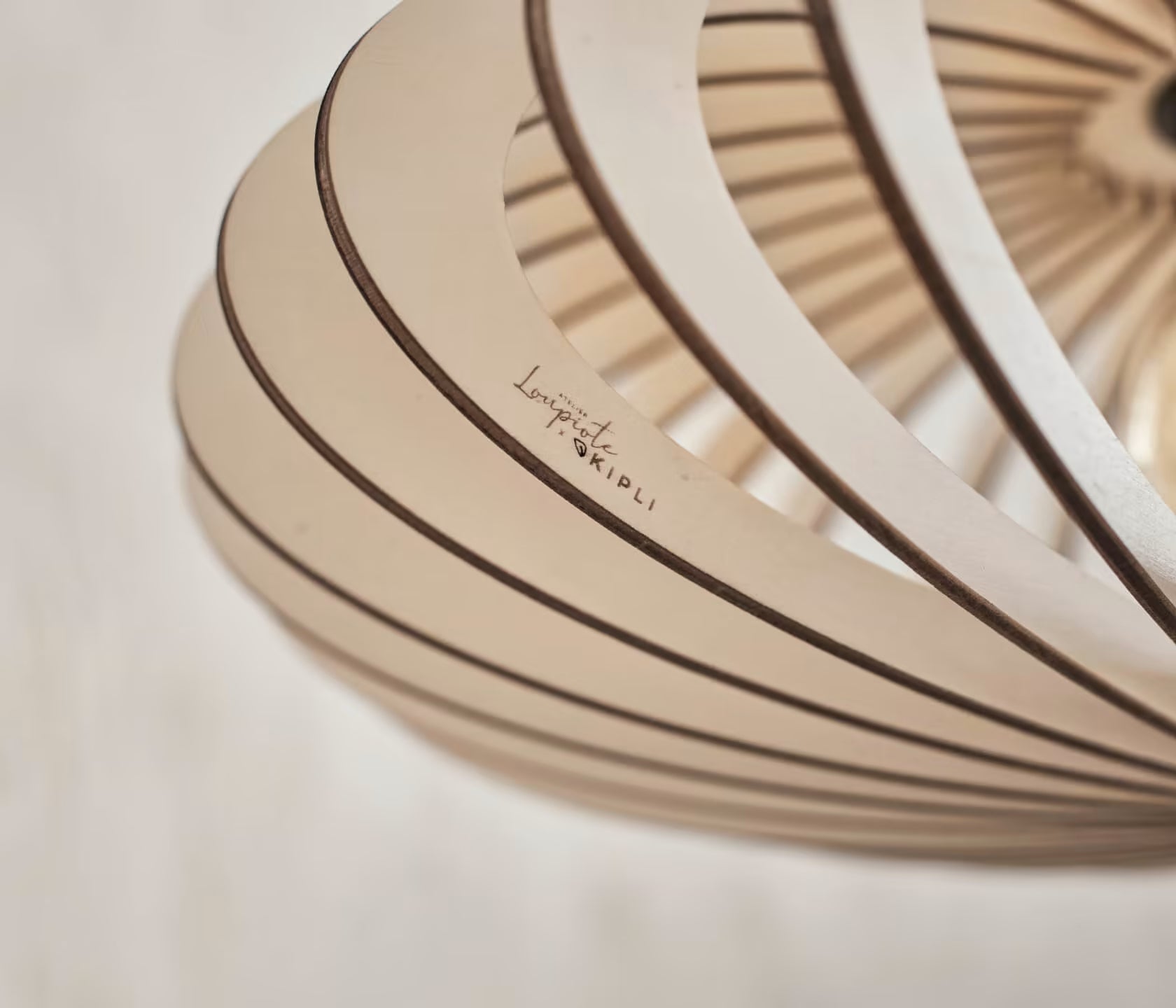 Délicates et élégantes, les courbes de la suspension NEO, issue de la collaboration Atelier Loupiote x Kipli, créent un jeu d'ombres pour une atmosphère chaleureuse et naturelle.